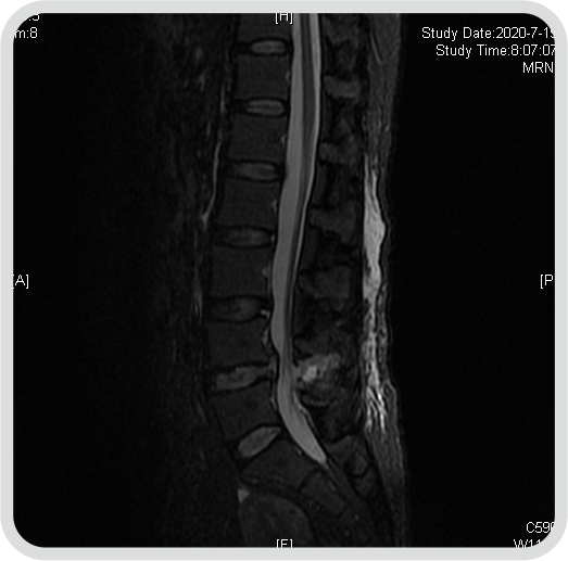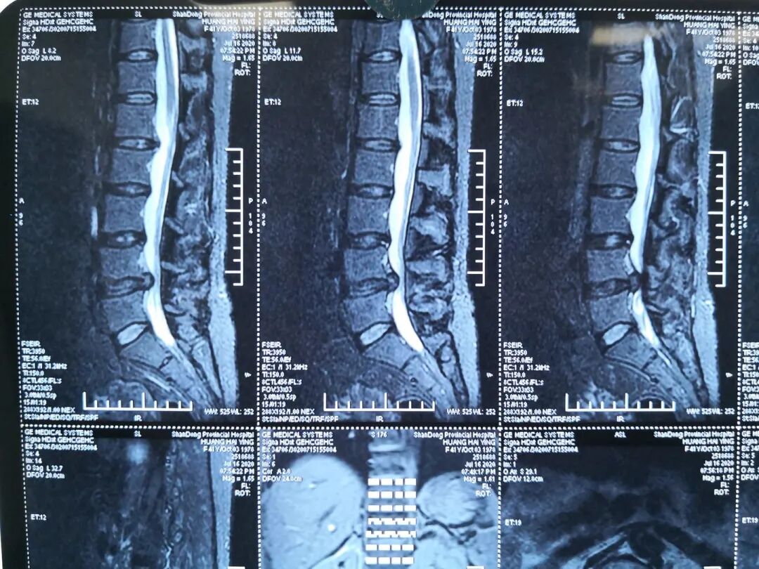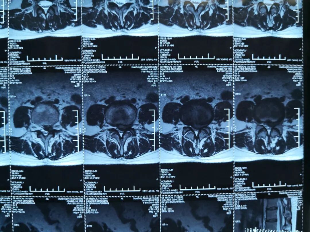 查体: 腰椎生理曲度存在,腰椎屈伸活动稍受限,L4/5棘突间及 棘突旁压痛,伴左下肢放射痛,左侧足背部感觉减退,双下肢肌力正常,左路背伸肌力4级一,左下肢直腿抬高试验及加强试验阳性,双侧膝腿反射(+),双侧跟健反射(+),巴氏征(-),双下肢水梢毛细血管充盈良好。
