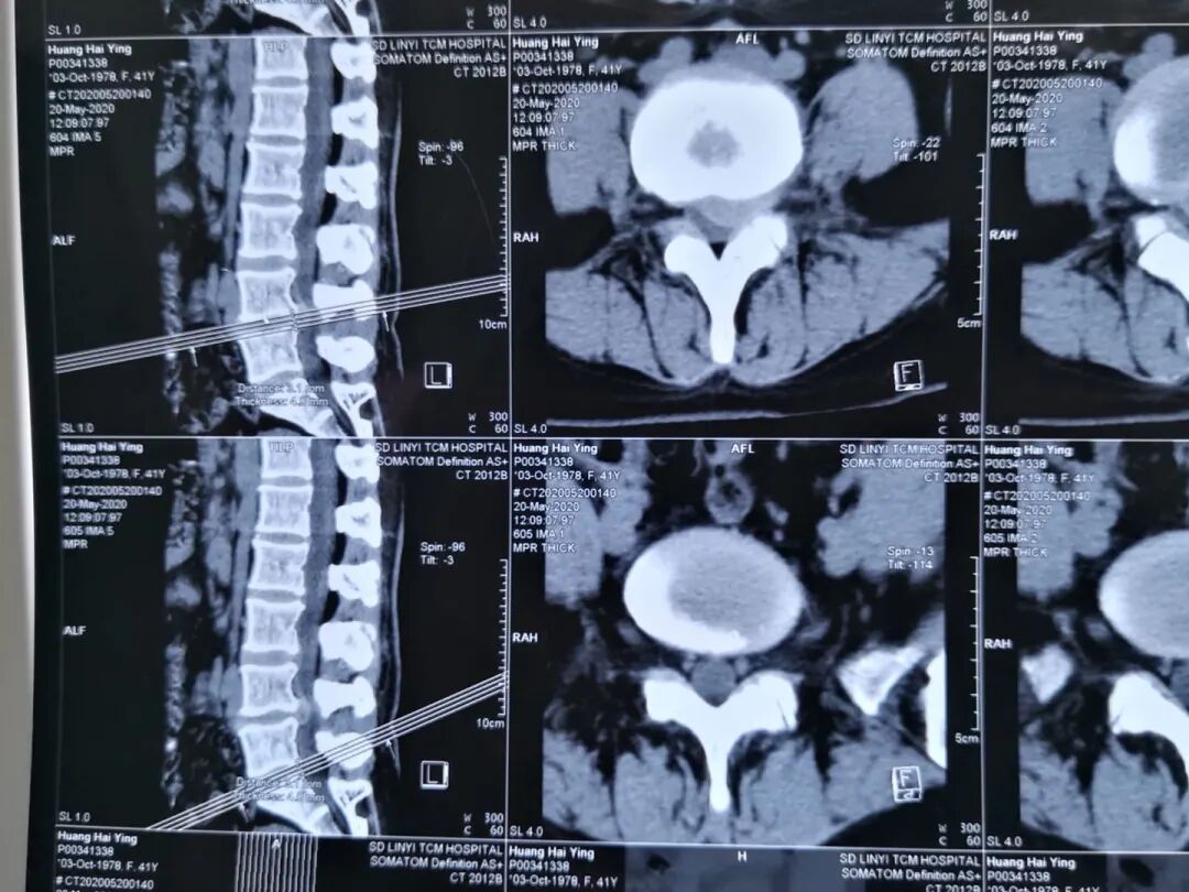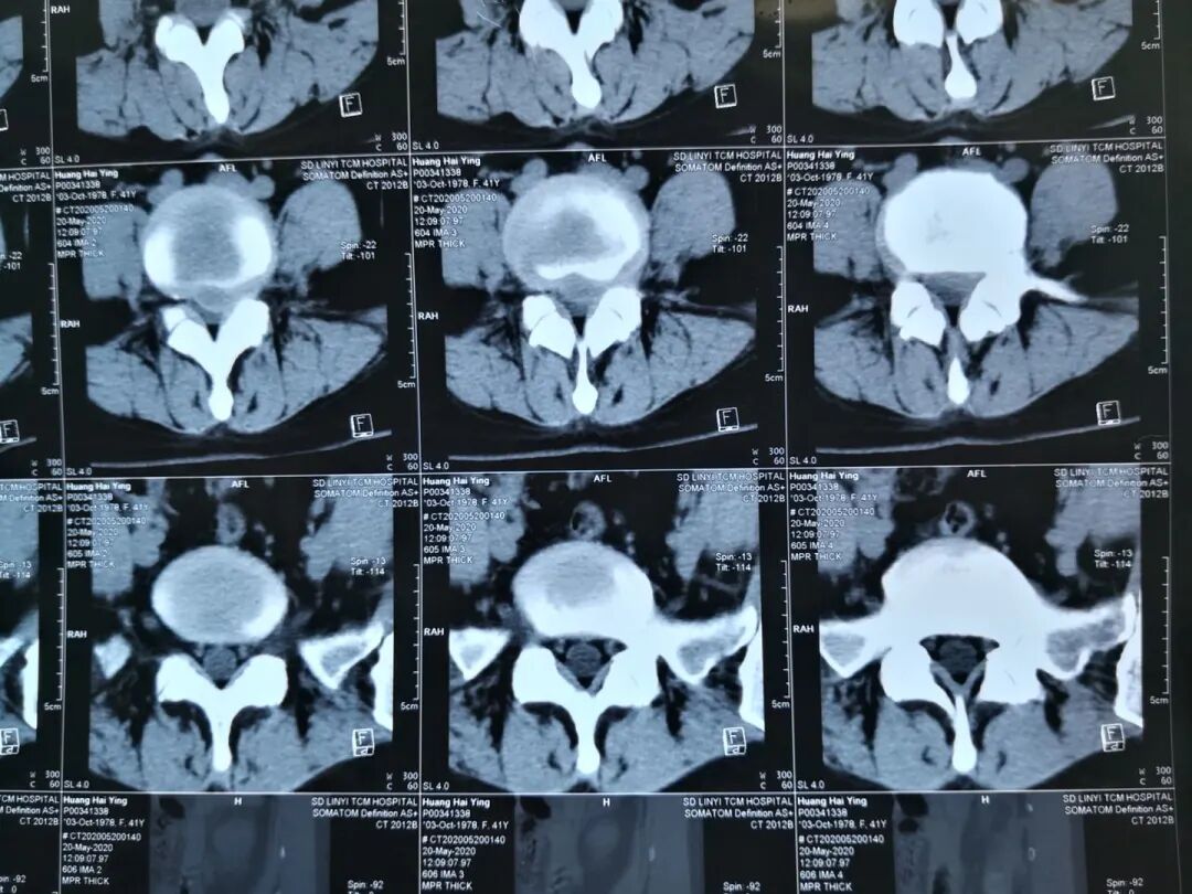 患者,黄某某,女,41岁,因左下肢疼痛伴麻木2年,加重半年入院;患者2年前无明显诱因出现左下肢疼痛,疼痛自臀部放射到小腿外侧,伴有足背部麻木感,活动后加重,于当地医院行CT检查示L4/5腰椎间盘突出,患者未予特殊治疗,近半年以来,感左下肢麻木疼痛加重,症状反复发作,行走后加重,影响日常生活,于院外的保守治疗无效。
